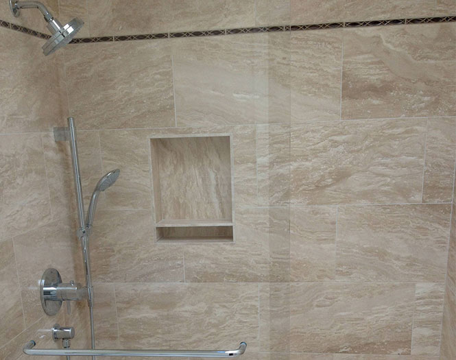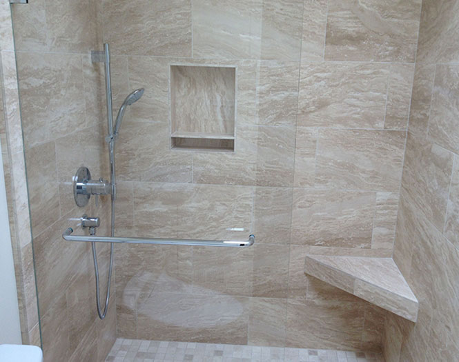 We were able to fit a walk-in Travertine marble shower conversion into this tiny space, allowing for better client mobility and access.